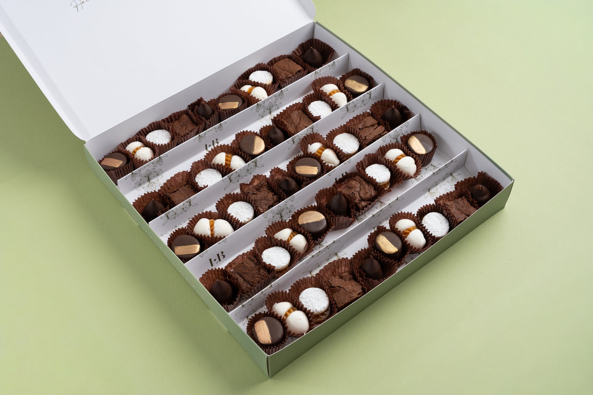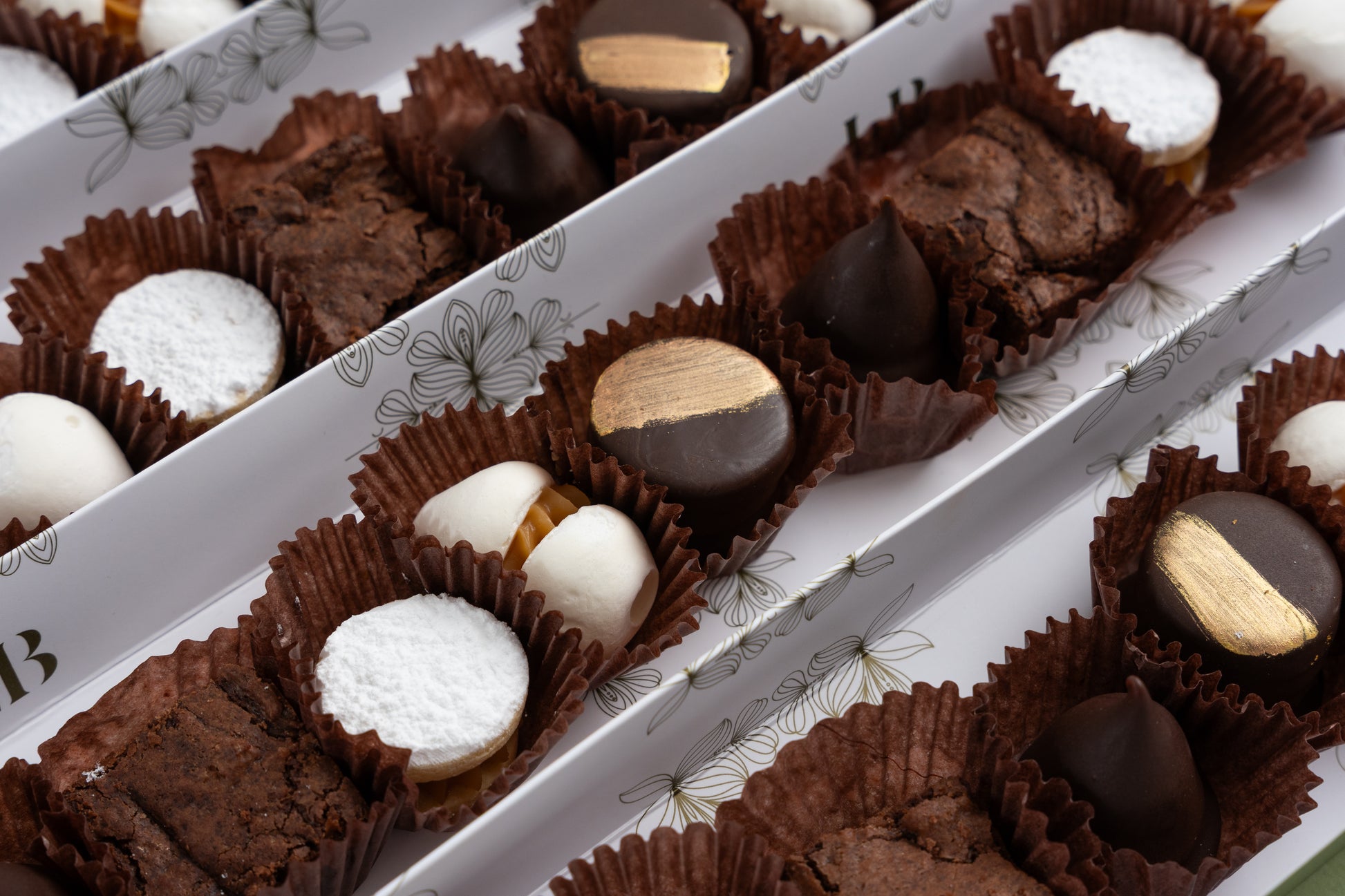 Una exquisita selección de mini pastelitos: brownie, alfajor de chocolate, merenguitos con